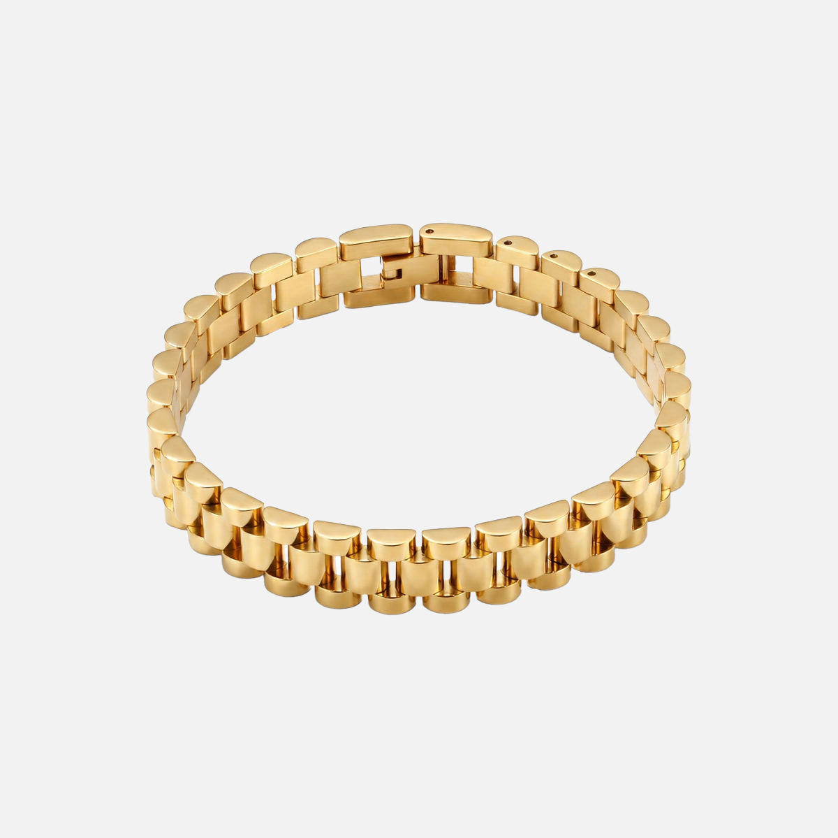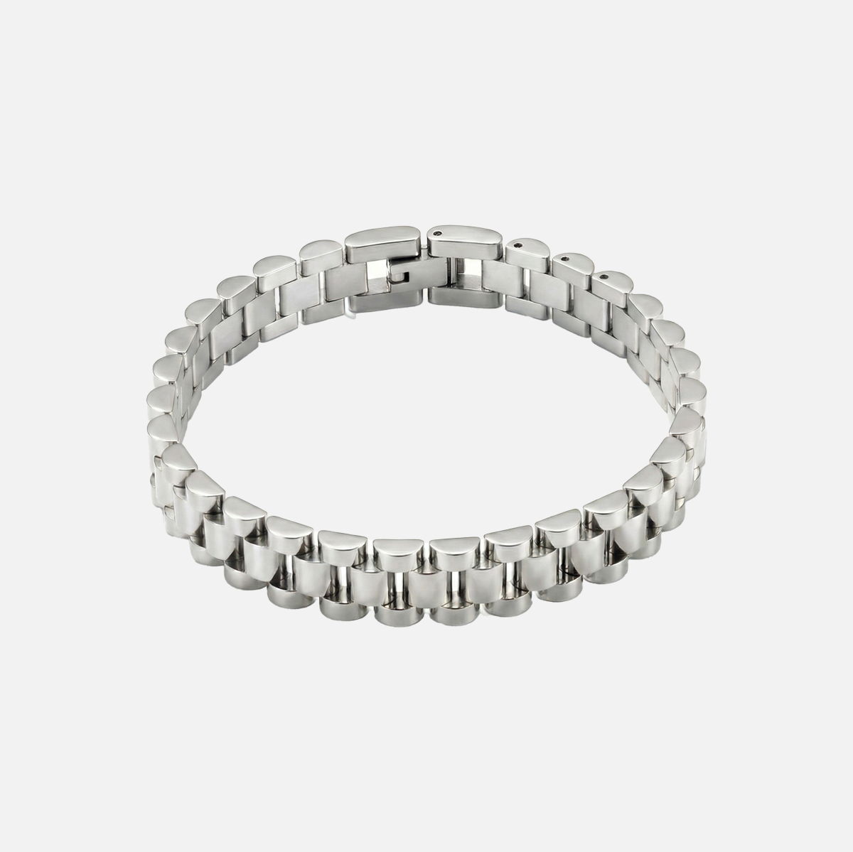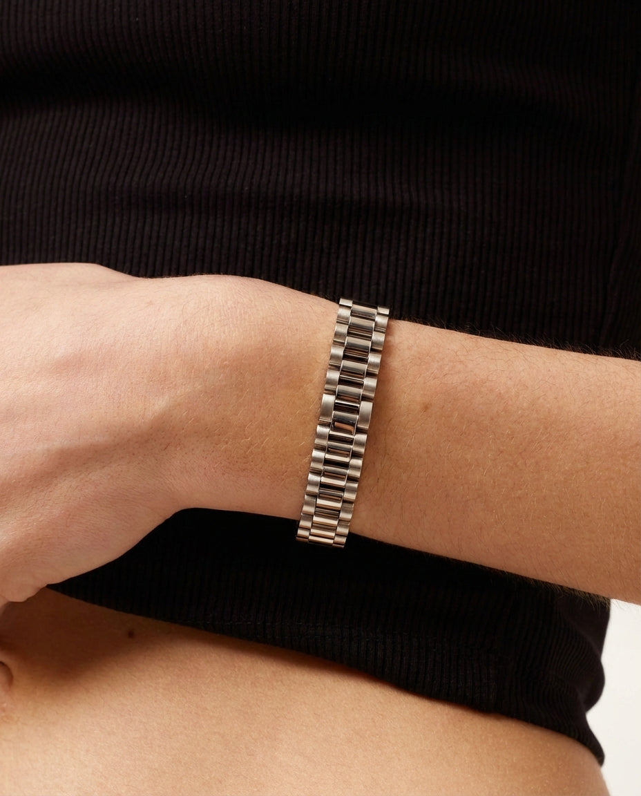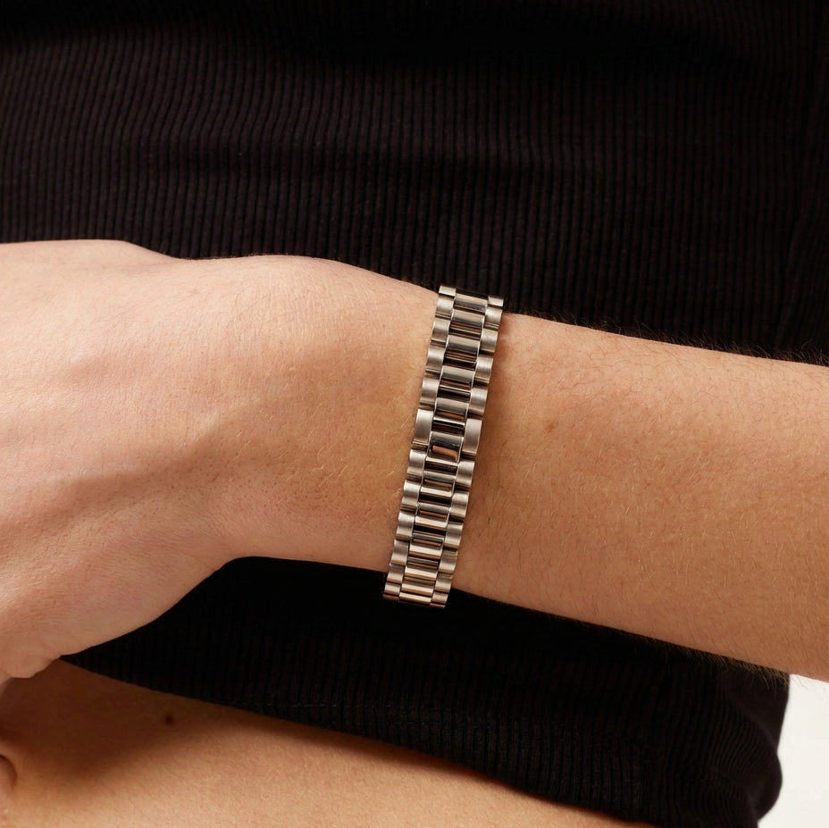 ONE SIZE: FULLY ADJUSTABLE 8.5" LINK BAND. ADJUSTER TOOL INCLUDED.